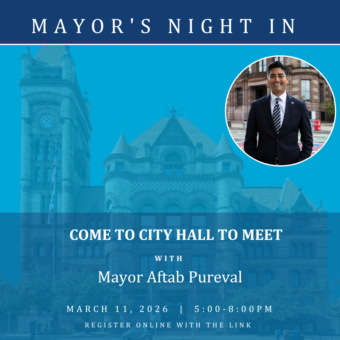 Mayor Aftab wants to hear from you! The next Mayor's Night In is March 11th from 5:00 - 8:00pm. Residents will join the Mayor to discuss the issues, priorities, or ideas that matter most to them.