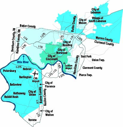 GCWW supplies about 45 billion gallons of water each year through more than 3,100 miles of water mains to 243,000 residential and commercial accounts, representing at least 1.1 million customers. The GCWW service area includes the entire City of Cincinnati, most of Hamilton County, and parts of Butler and Warren Counties in Ohio, and Boone County in Kentucky.