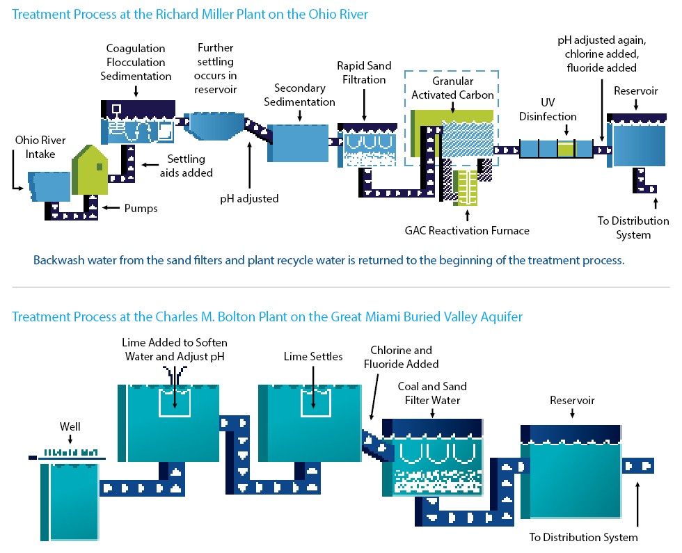 GCWW draws its water from the Ohio River and the Great Miami Aquifer near Fairfield and uses state-of-the-art water treatment technology, including: