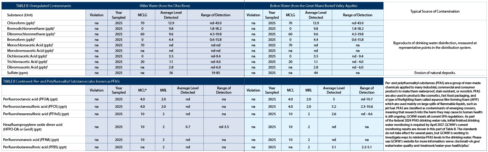 Unregulated Contaminants (Table B): Unregulated contaminants are those for which EPA has not established drinking water standards. The purpose of unregulated contaminant monitoring is to assist the EPA in determining the occurrence of unregulated contaminants in drinking water and whether future regulation is warranted. Additional contaminants were monitored and not detected. If you would like further information on the results of unregulated contaminant monitoring, please call 513.591.7700.